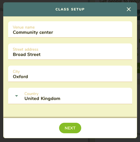 Here, you'll need to pick one of your existing venues or create a brand new venue for your class. This can be a physical venue, or an online location (like a Zoom room or any other virtual place). Any venues you create will then be available to reuse for future classes, so you don't need to create new locations over and over again.