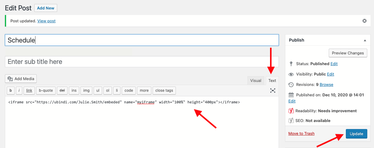 on some WordPress sites, this won't work and you will find that the Ubindi widgets is not appearing. In this case, you need to use a "plugin" for iframes.